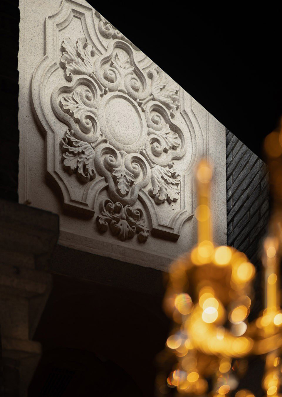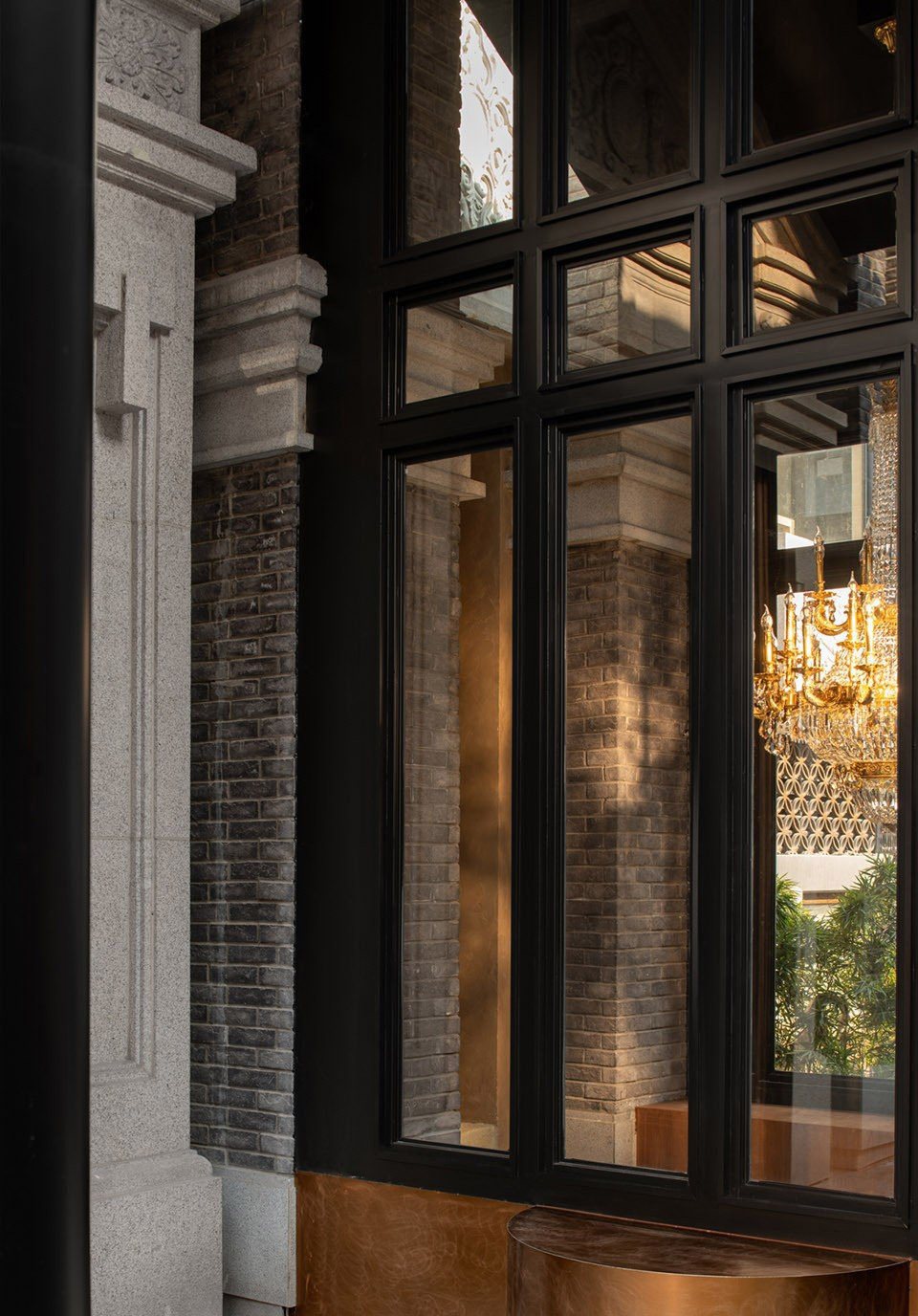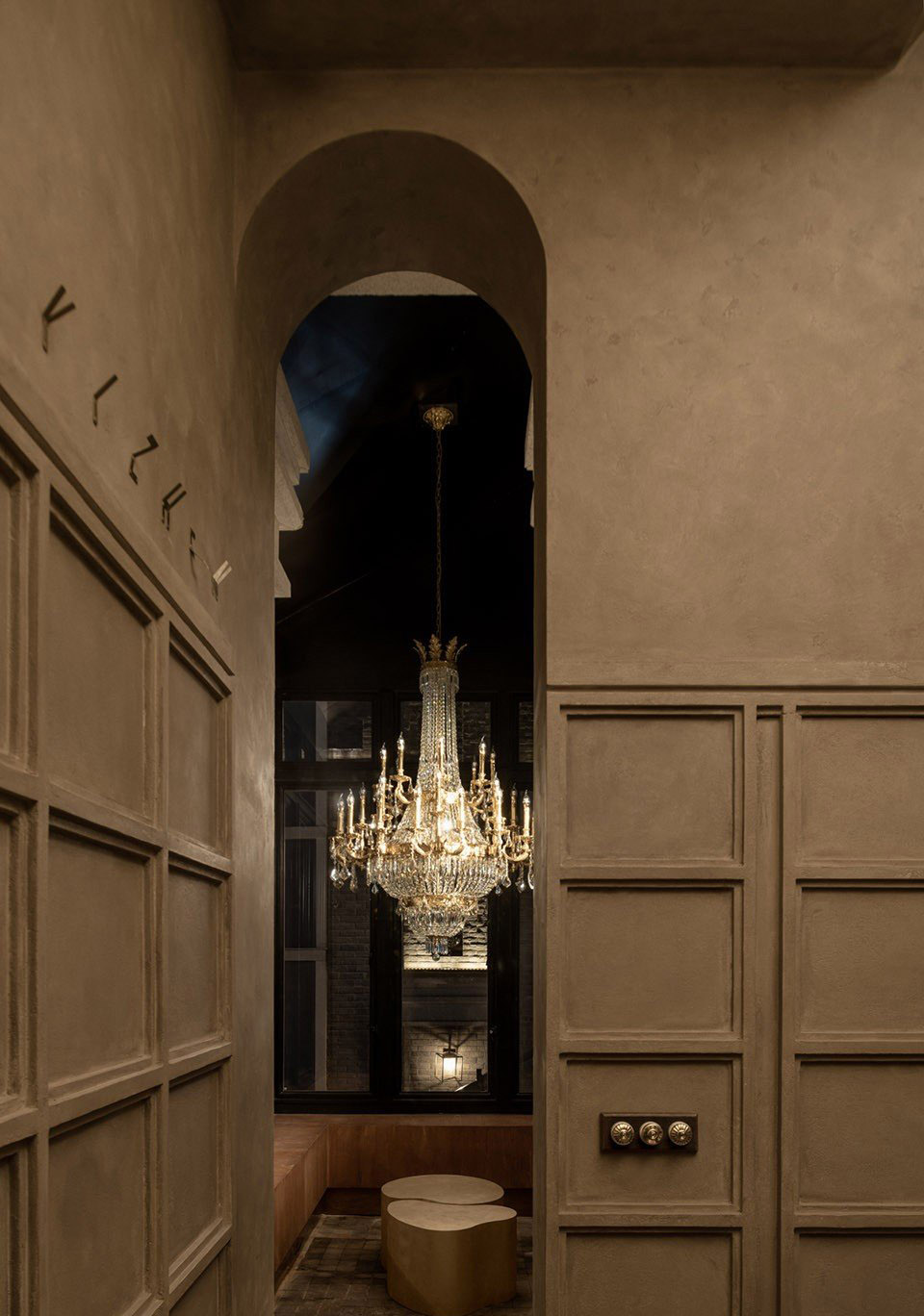依托于可利用的建筑外擺區(qū)空間,我們?cè)诒WC原建筑不受破壞的前提下,進(jìn)行了大膽的外部空間拓展與規(guī)劃。在通過(guò)一系列建筑及景觀化的設(shè)計(jì)干預(yù)后,我們不僅為原建筑創(chuàng)造了可供休息、停留、甚至是遮風(fēng)避雨的外擺區(qū)域。同時(shí),亦從引流的角度,還為該物業(yè)創(chuàng)建了一個(gè)視覺(jué)中心,即一個(gè)與原建筑完美共生的鋼結(jié)構(gòu)玻璃小屋。在玻璃小屋內(nèi),我們運(yùn)用蒙太奇的處理手法,大膽且夸張的放置了一盞超大的復(fù)古水晶吊燈,這盞吊燈幾乎填滿整個(gè)小屋,在燈光的加持下,尤其引人矚目。