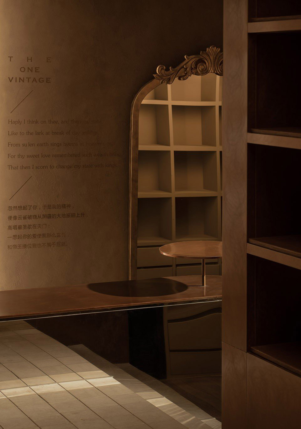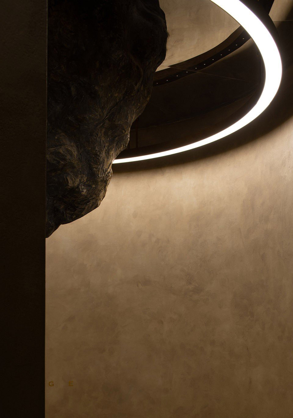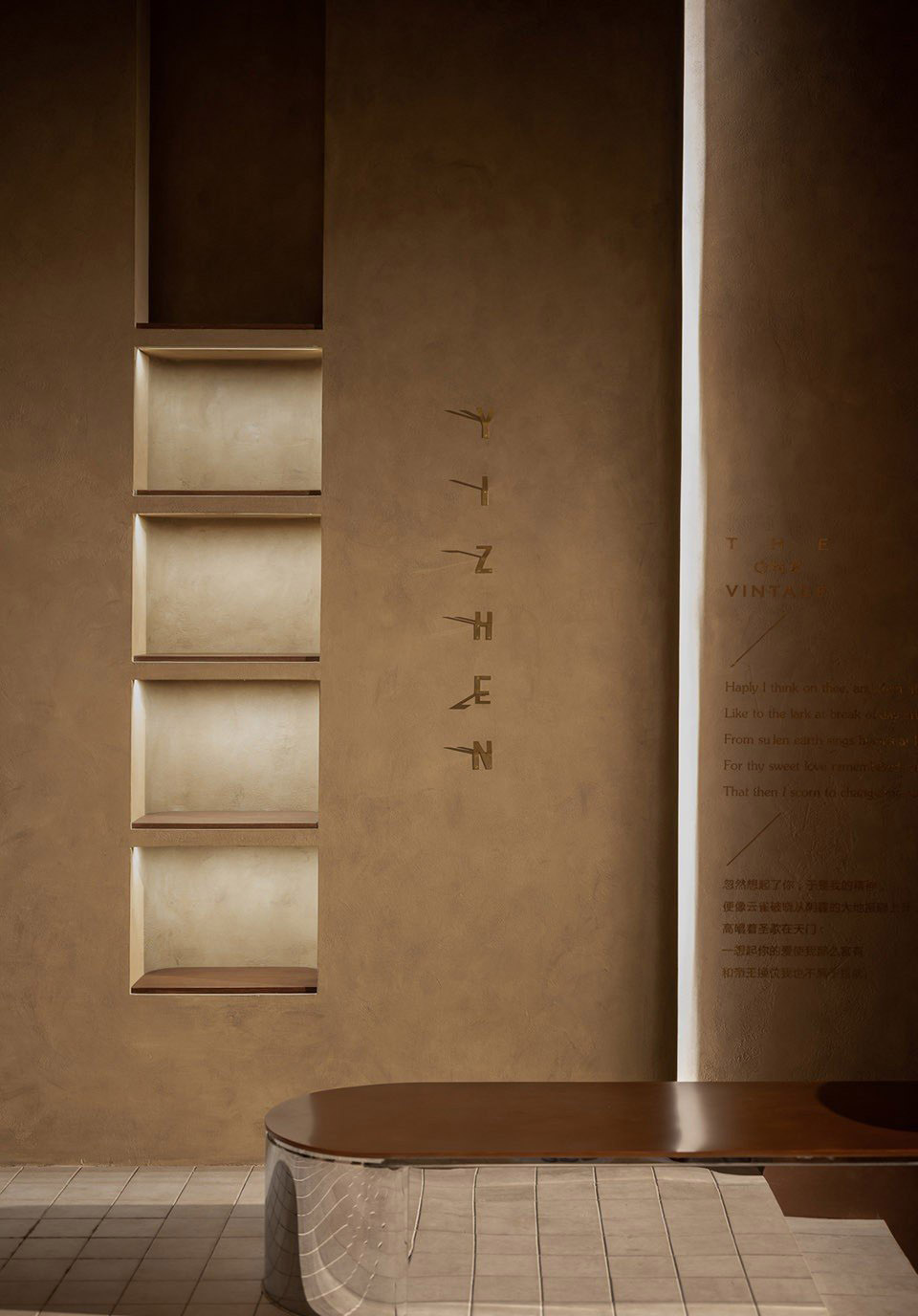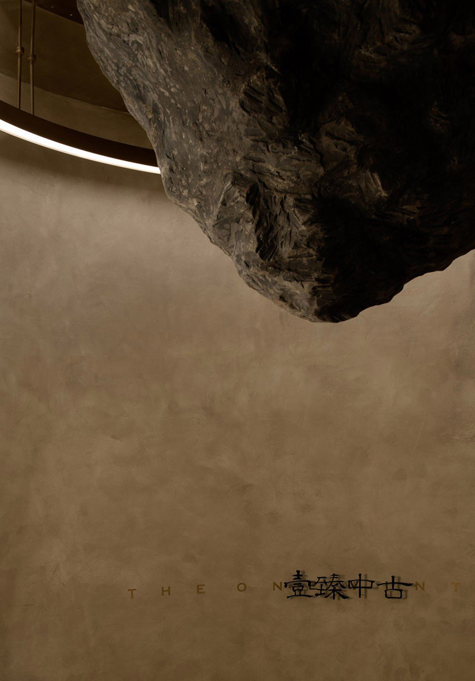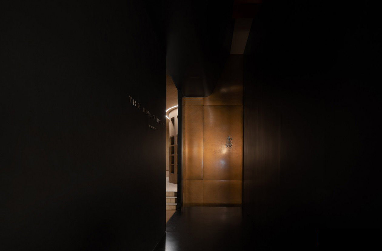 所以,室內(nèi)空間的規(guī)劃,是依托于消費(fèi)動(dòng)線與品牌認(rèn)知過(guò)程而展開(kāi)的構(gòu)思邏輯。首先,我們用一個(gè)狹長(zhǎng)的門廊通道將原空間分為了左右兩個(gè)空間物理關(guān)系。并在這個(gè)黑色立方體的末端設(shè)置了一面做舊的銅板墻體,設(shè)置這種色彩、質(zhì)感的目的,除了可以形成一個(gè)引導(dǎo)進(jìn)入的視覺(jué)關(guān)系外,其表面懸浮的壹臻logo,也是在通過(guò)某種心理暗示告訴到訪的客人,“我”的名字叫——壹臻。