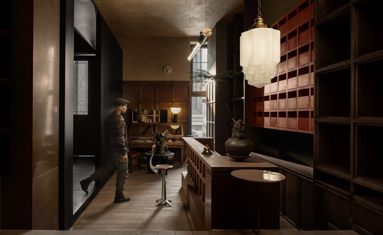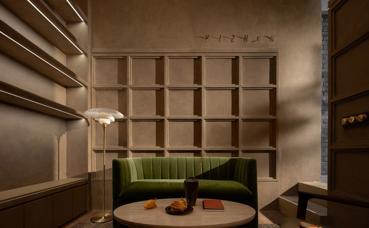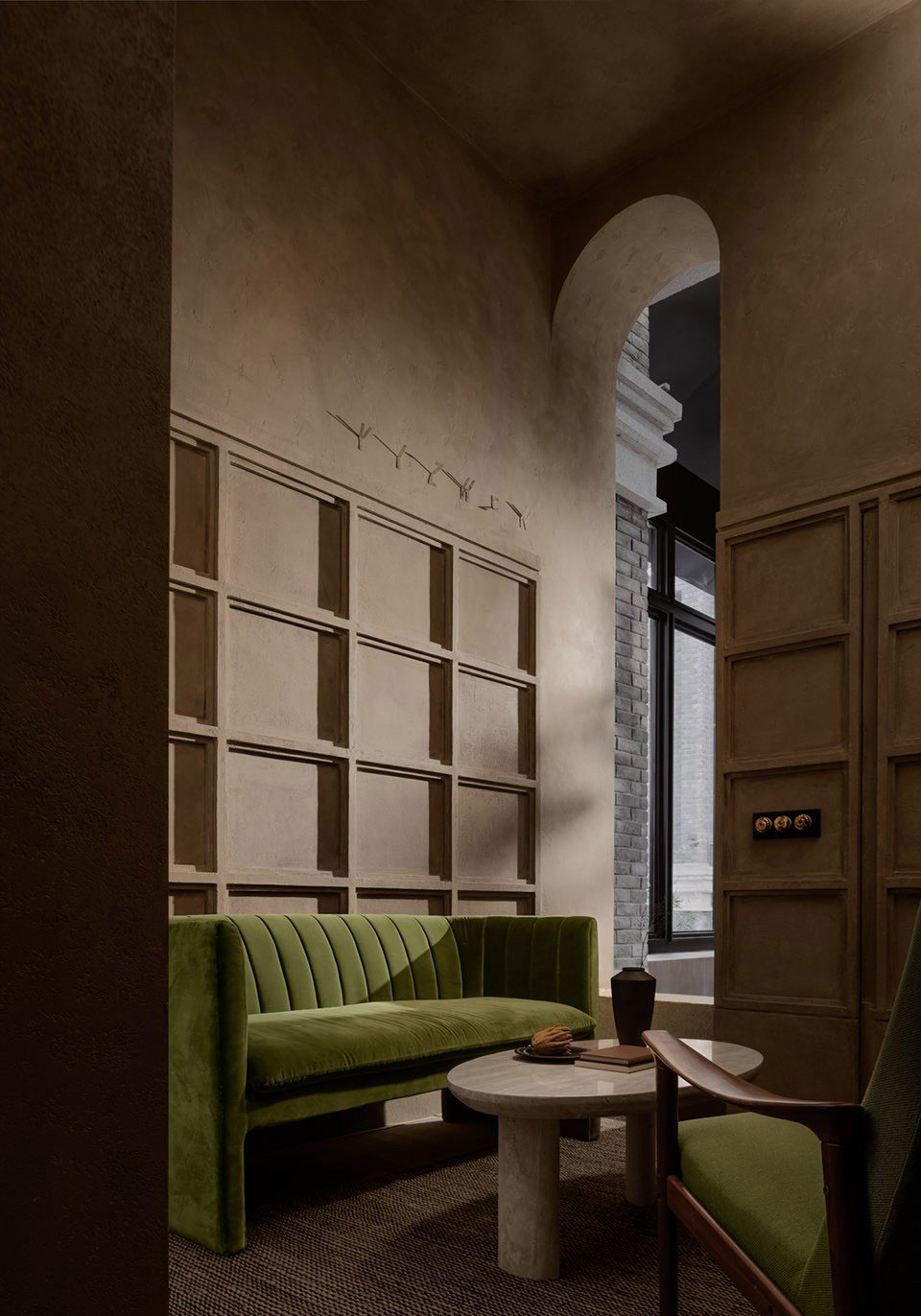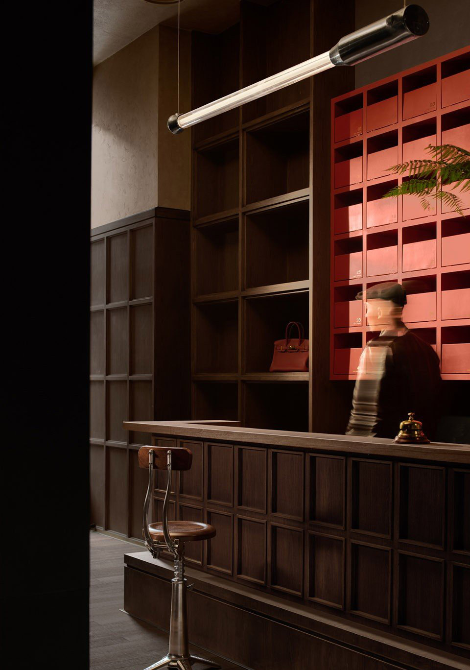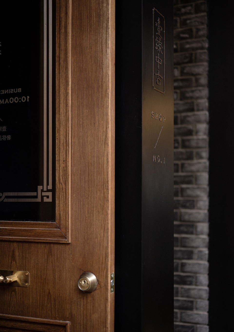 所以,室內(nèi)空間的規(guī)劃,是依托于消費(fèi)動(dòng)線與品牌認(rèn)知過(guò)程而展開(kāi)的構(gòu)思邏輯。首先,我們用一個(gè)狹長(zhǎng)的門廊通道將原空間分為了左右兩個(gè)空間物理關(guān)系。并在這個(gè)黑色立方體的末端設(shè)置了一面做舊的銅板墻體,設(shè)置這種色彩、質(zhì)感的目的,除了可以形成一個(gè)引導(dǎo)進(jìn)入的視覺(jué)關(guān)系外,其表面懸浮的壹臻logo,也是在通過(guò)某種心理暗示告訴到訪的客人,“我”的名字叫——壹臻。