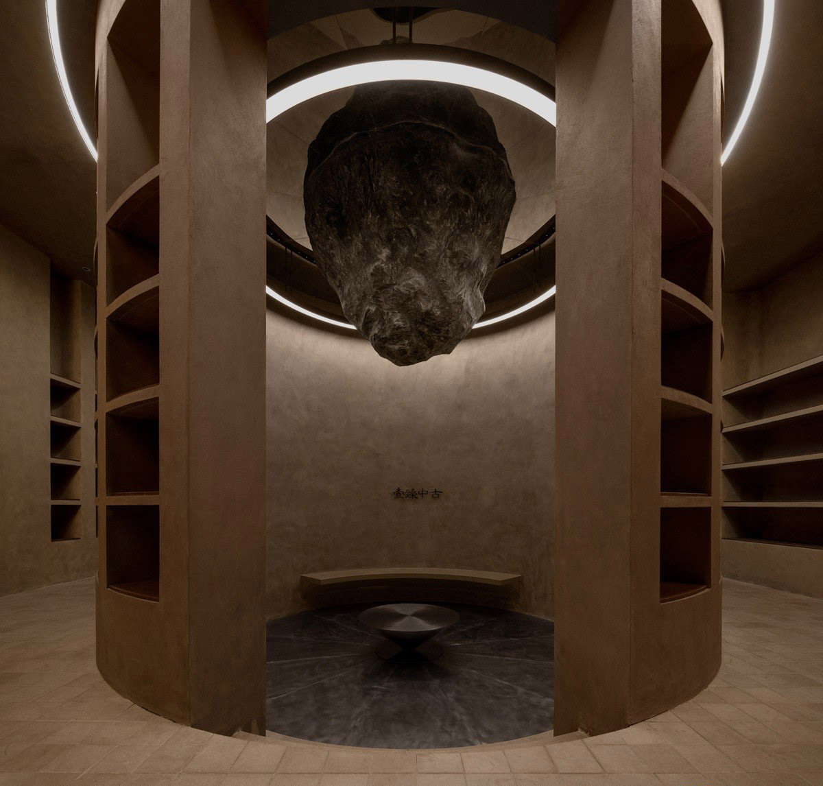 環(huán)形的通道,讓“逛”的購(gòu)物體驗(yàn)在本不算大的室內(nèi)空間里得以保證。同時(shí),當(dāng)你跟著我們預(yù)設(shè)好的路線,進(jìn)入到商店最里面時(shí),你會(huì)發(fā)現(xiàn),圓柱體被打開(kāi)了一道口子,在這圓柱體的“身體”里,有一顆可以“呼吸”的“心臟”。這是我們的一處小心思,也是給予消費(fèi)者的一個(gè)驚喜,更是我們對(duì)于「壹臻」生命力的期望。一顆閃爍的山城之心。