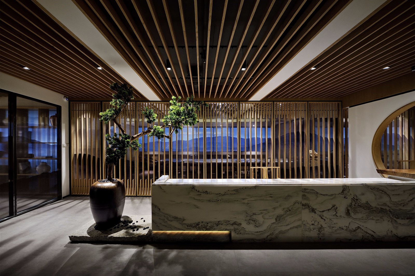 該項目位于福州金源大廣場25層,為國廣一葉裝飾設(shè)計機構(gòu)的主要辦公場所之一。中式意境不但要有環(huán)境供養(yǎng),更需精神文化的濡染。在本案中,琴棋書畫、翰墨書香、茶庭禪境,都作為文化內(nèi)容納入整個空間的規(guī)劃中,入門區(qū)的宛如山脈連綿起伏的吊頂,極重文脈依云,使得空間中具有禪味的裝飾,處處呈現(xiàn)出耐人尋味的內(nèi)斂。